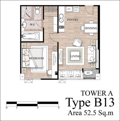 - 1 Bedroom 1 Bathroom area 52.5 Sq.m.